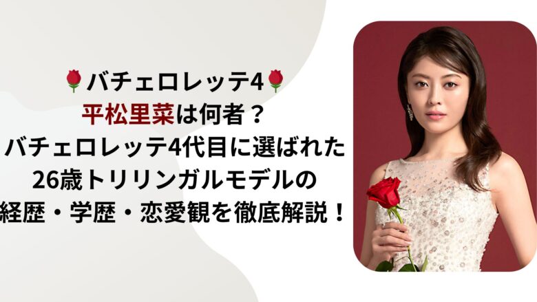 「平松里菜って何者?」 SNSやニュースを見て、こう思った方、多いんじゃないでしょうか? 2026年3月31日、Prime Videoの大人気恋愛リアリティ番組『バチェロレッテ・ジャパン』シーズン4の4代目バチェロレッテとして、平松里菜(ひらまつ りな)さんが発... バチェラー