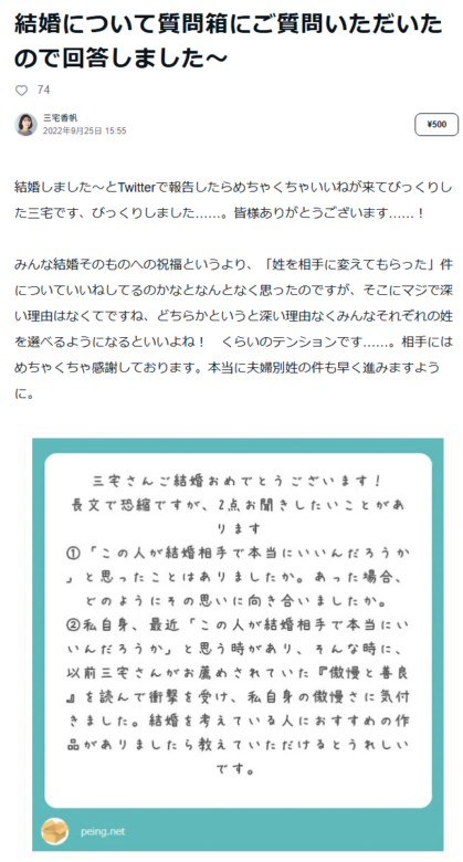 - 三宅香帆さんは2022年9月23日に結婚を公表